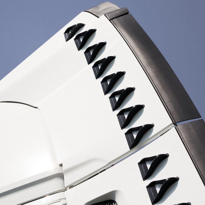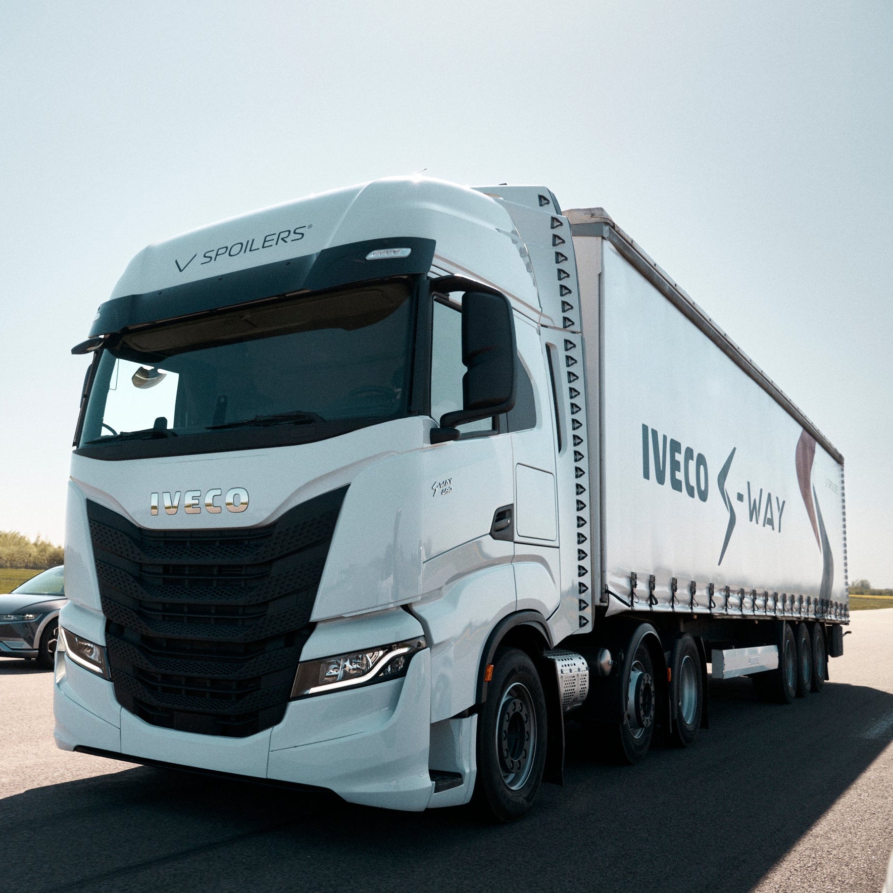 VSPOILERS optimize the aerodynamics around the cab, thereby greatly minimizing drag and turbulence between the cab and trailer. With a front body, the wind is lifted over the box, optimizing the wind flow from the cab to the body. The best results from on-road tests via truck manufacturers' systems are savings of 7-9%. In addition, there are wind tunnel tests conducted by one of the world's most reputable institutes, Edr Medeso, where you can find their report on our website.