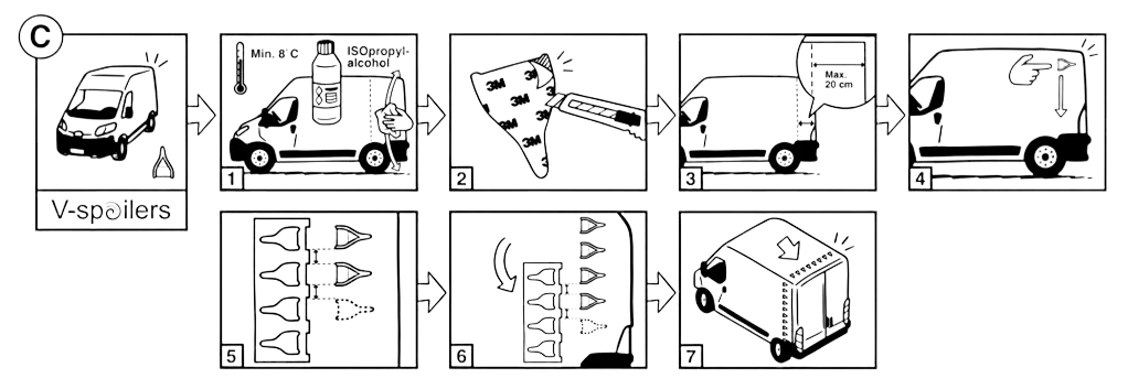 V Spoilers til lav varebil 40 stk. f.eks. Ford Transit Custom. Dette kit indeholder 40 stk. hvide singles. Montering se her. Afstand fra bagerste punkt på bil, til bagspids på V Spoilers 10-20 cm, 11 cm fra midt til midt. Samme gælder for taget. Købes der reflekser til, skal disse kun på siden. V Spoilers har ingen virkning under 45 km/t.